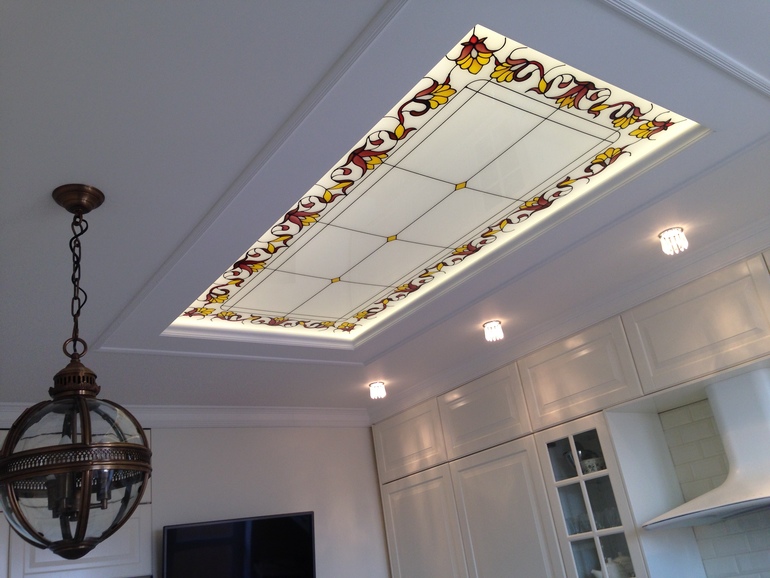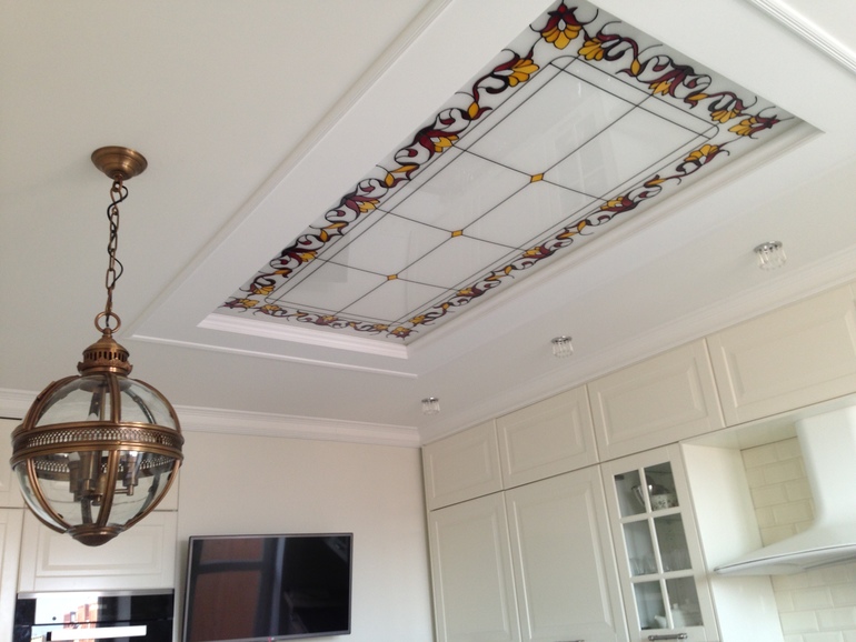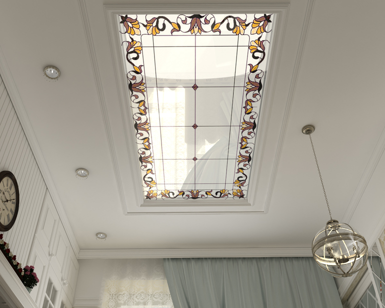 Витражное окно на потолке сделано точно по проекту. По вечерам со включенной подсветкой вид восхитительный!