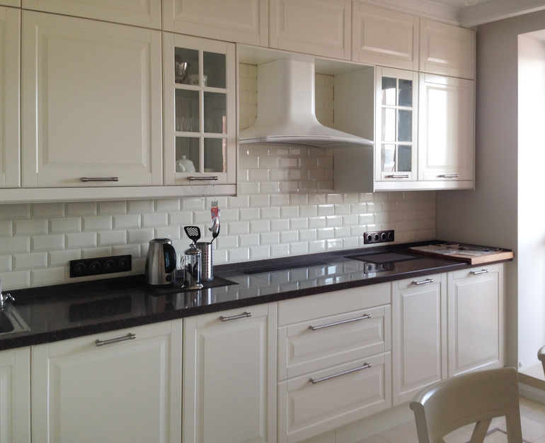При реализации кухня подверглась наибольшим изменениям. Декоративный короб над плитой решено было не делать, вместо него появилась красивая вытяжка, которую нет нужды закрывать. Плитка также сменилась на лаконичный кабанчик.