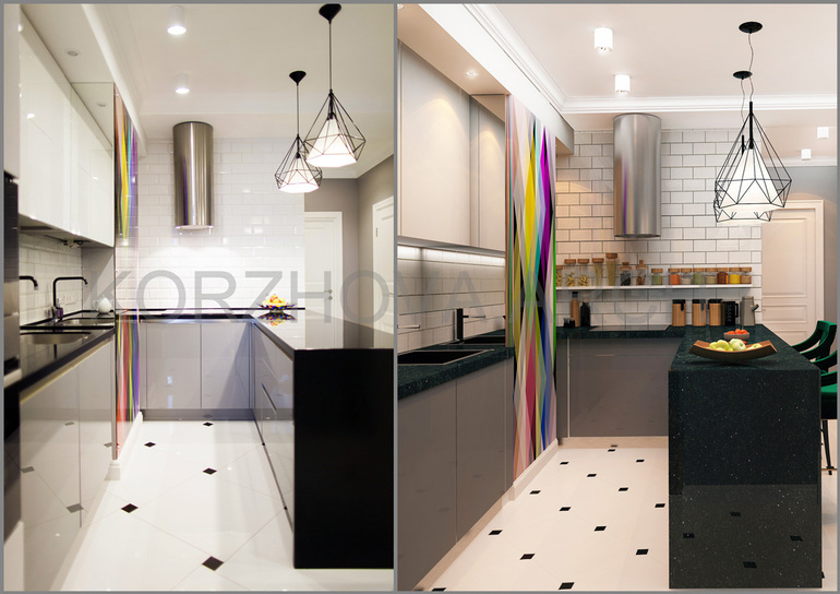 Вот кухня, с торца зеркало, поэтому с определённых ракурсов она кажется просто бесконечной)