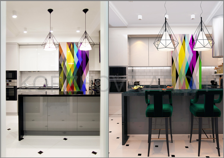 Яркое пятно в виде напечатанном на стекле рисунке, очень разбавляет всю строгость цветов и планировки.