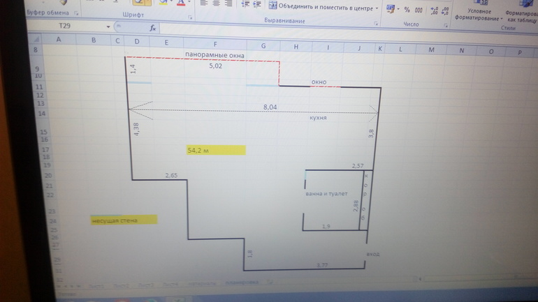 Добрый день, никак не могу распланировать квартиру,помогите.Площадь 54,2 + 5 кв где панорамное окно