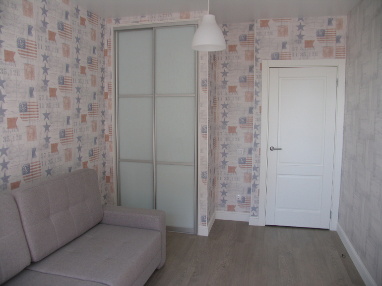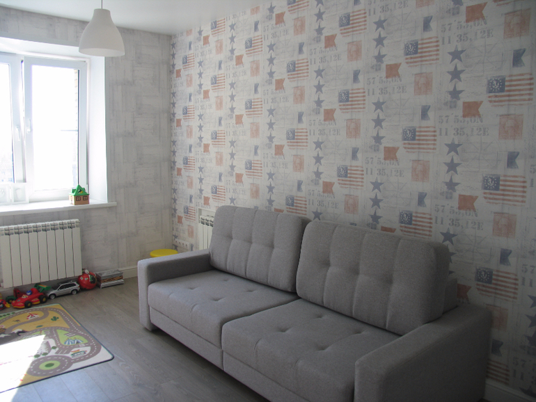 Детская, надеюсь в этом месяце обзаведется мебелью ))) Сразу пишу, это не американский флаг, там совсем другой морской символ, там везде навигация. Поэтому прошу не бросать в меня тапки - типа я не патриот. Просто мне обои очень понравились, хорошо подошли к нашей гамме и о политике я вообще не думала )))