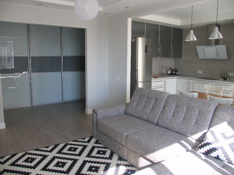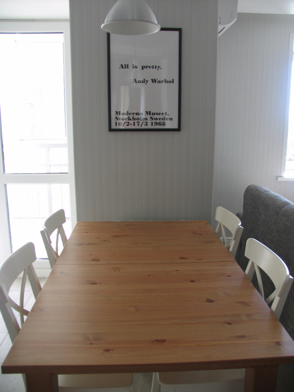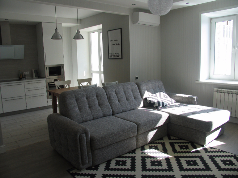 Гостиная и кухня у нас совмещены как и у многих. Кухня пластиковые фасады в алюминии. Стол и стулья Икея, диван Юваю