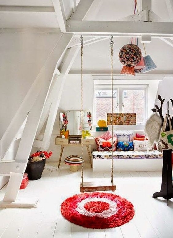 Вариантов можно придумать много, что то подвесить к деревянной балке не проблема. Если готовые деревянные хотите обратите внимание на Karrusell или того же производителя просто Карусель