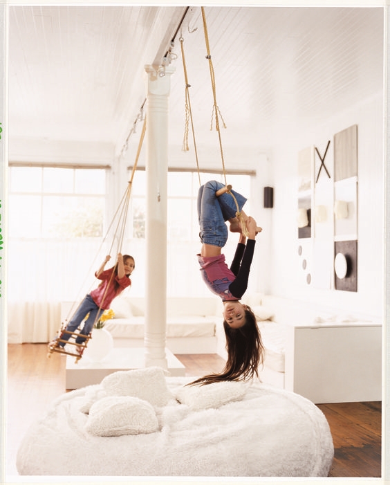 Никак не могу выбрать, хочется и маленький и чтоб было места для кручения на кольцах, для катания на качеляхб и чтоб можно было например на кольцах залететь на кровать. Вот думаю может купить самый простой, лестницу. А для остальных элементов забить пару крюков в потолок, но на фото что я видела -это в основном в домах на балках. Так кто-то делала у себя дома? Еще очень нравится кресло-гамак, но тоже никак не придумаю куда его прицепить.