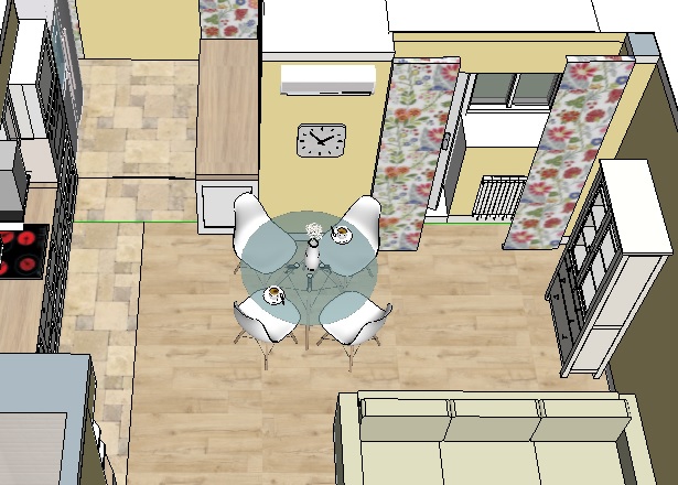 Вот попробовала примерить в программе. Стол получился диаметром 110 см и стулья eames. Стол планируется под цвет дерева.