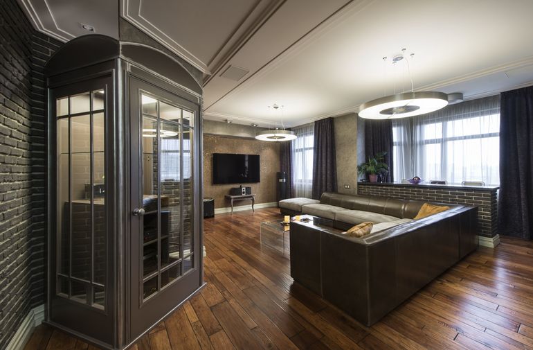 Диван в середину комнаты с журнальным столиком. телевизор, с большой диагональю, на 2.81. И будет вам радость)