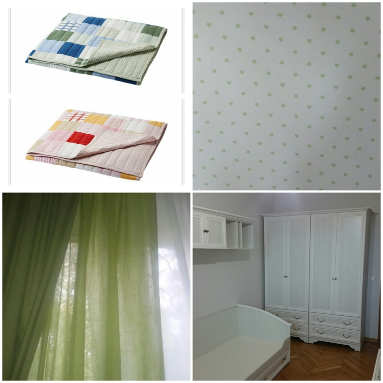 Мебель белая/белый рамух, обои белые в мелкуюсалатовую звездочку,шторы и покрывала в икее купила...