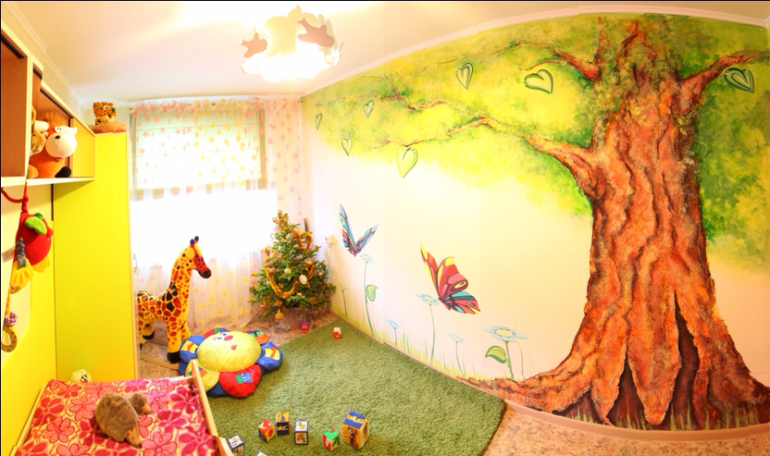 Роспись выполняется безопасными для здоровья красками, стена потом поддается влажной уборке, не пачкается. Цвет со временем не выцветает, краски остаются такими же яркими долгое время.