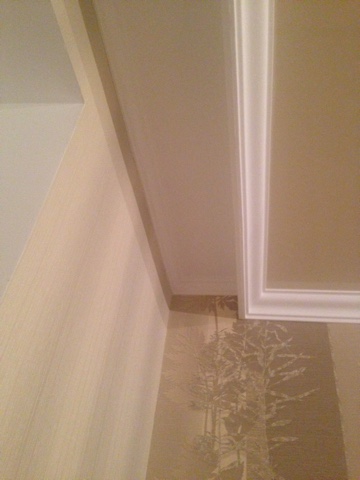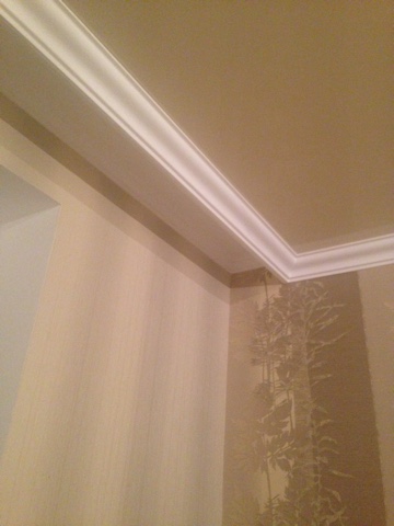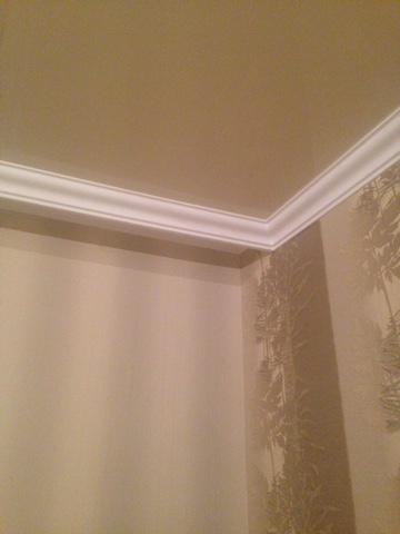Нам сначала прибили деревяные бруски, потом натянули потолки, с внутренней стороны на брус пришпандорили гипсокартон, и на него с внешней стороны приклеили потолочный плинтус. Все красивенько и аккуратненько зашпаклевали и покрасили. По краю стены внутри приклеили тоже плинтуса, но потоньше. Карниз еще не разместили. Кстати, через брус нам вывели проводку для подсветки. Мне кажется, весь смак, такого карниза, это подсветка из под него.