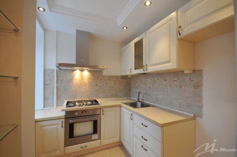 Соглашусь с комментарием о римской шторе на кухне и классике в зоне гостиной. А покажите фартук поближе :) какая там плитка?