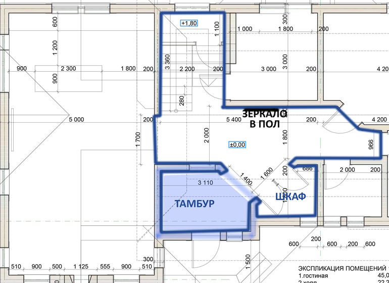 Холл с кучей нарезанных углов и с аркой в гостинную. Ну и лестница на второй этаж