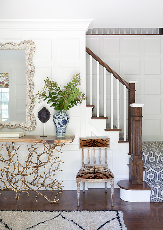 Сначала тамбур, который не отделен от холла дверью, да и еще имеет большое окошко под витраж в тот же холл.