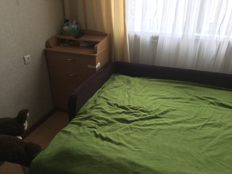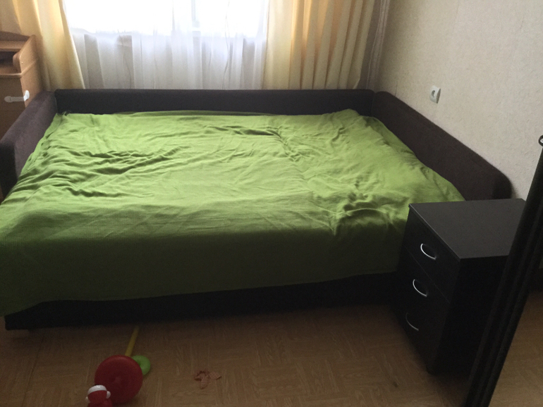 1. Спальное место для родителей и малыша. Спим мы сейчас так - я с сыном (так как он еще на грудном вскармливании) на этом диване, а папа в другой комнате. Когда вернуться родители, муж вернется в нашу комнату. Ребенка отселить быстро в отдельную кровать не получится, тем более, что завершать грудное вскармливание пока в планах нет, однако спать втроем на одном диване нам тесно. Поэтому нужна отдельная кроватка, которую бы на время снов можно было придвигать к нашему нынешнему дивану, а потом отодвигать, плюс она долдна быть уже на перспективу роста малыша, чтобы он потом мог в ней спать сам и у нее должны быть бортики с трех сторон, чтобы сынок спал в безопасности.