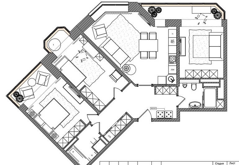а кухонный гарнитур нельзя вдоль эркерного окна пустить? а на его место диван и проход в комнату. У вас же вход в правую комнату через балкон?