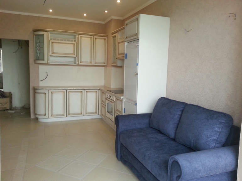 Интерьерное решение кухниИмеем кухню-гостинную 15 кв.м с выходом на балкон. Мебель и техника установлена, нет люстры и светильников, стена напротив кухни голая, напротив дивана телевизор. Вопрос в том, как совместить цвета мебели (особенно диван и стулья). Синий и беж? как правильно акценты расставить? Шторы с добавлением синего? вообщем в растеренности.