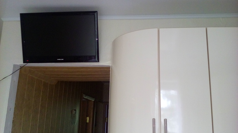 мне кажется телевизор лучше повесить в угол справа от шторы. и ретро смеситель с колизеем вроде как из другой оперы