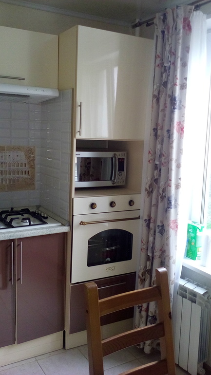 у вас мебель современная, а шторы , смеситель, колизей и духовка больше к классике или провансу подходят.