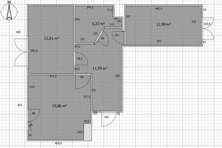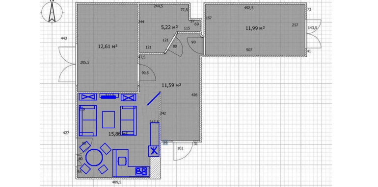 У меня в Планере закончился полный доступ, поэтому схематично вышло. Рядом с кухней маленький журнальный столик - схематично обеденный стол и стулья.
