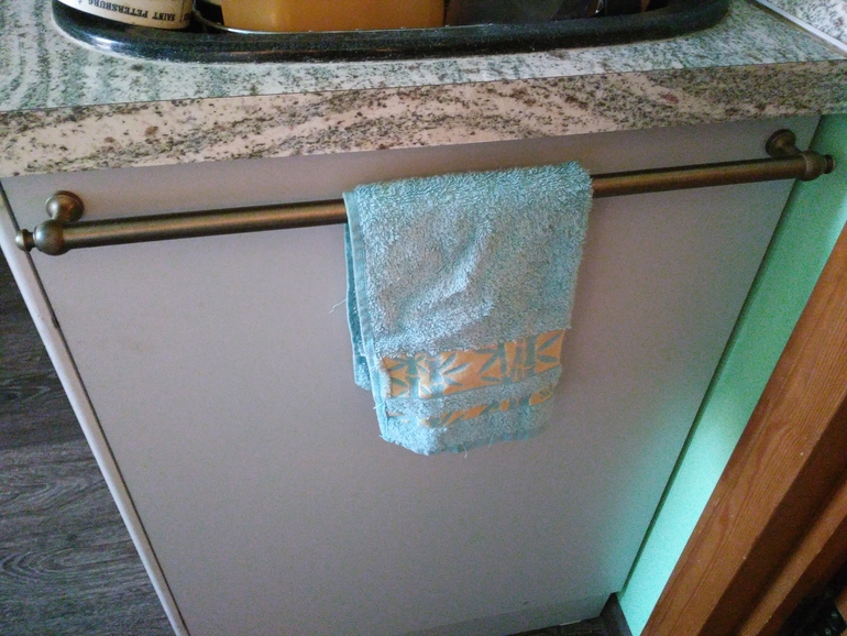 В самый угол за кофеварку спрячьте. Подберите полотенце в цвет столешницы, в глаза бросаться не будет. Просто уже поздно думать, куда спрятать, когда кухня готова. У нас висит в шкафу около раковины на крючке с обратной стороны дверцы, очень удобно. Еще есть бутылочницы с наполнением с крючочками, надо было такую слева от мойки делать.