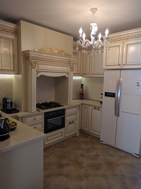 С такой красивой кухней ТОЛЬКО подбирать полотенца такого же цвета. И однотонные.