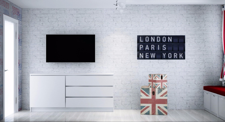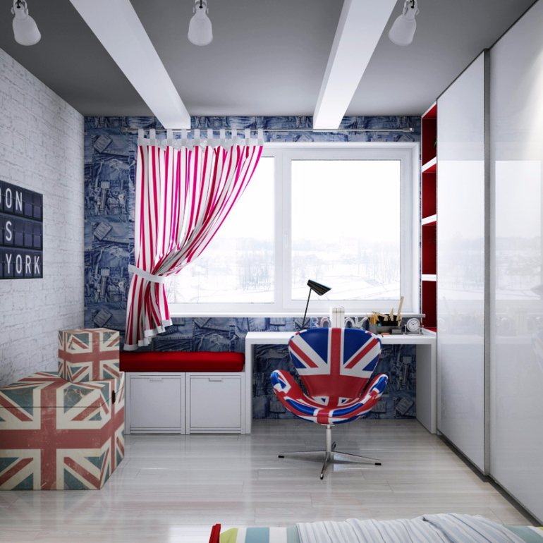 5. Еще одна комната для мальчика-подростка, 17,4 м2. Решено было отстановиться на тематике Британии. Но, если надоест, ее легко будет заменить на что-то другое - убрав стул, сундуки и шторы.