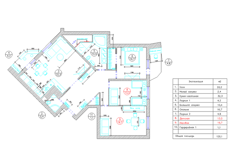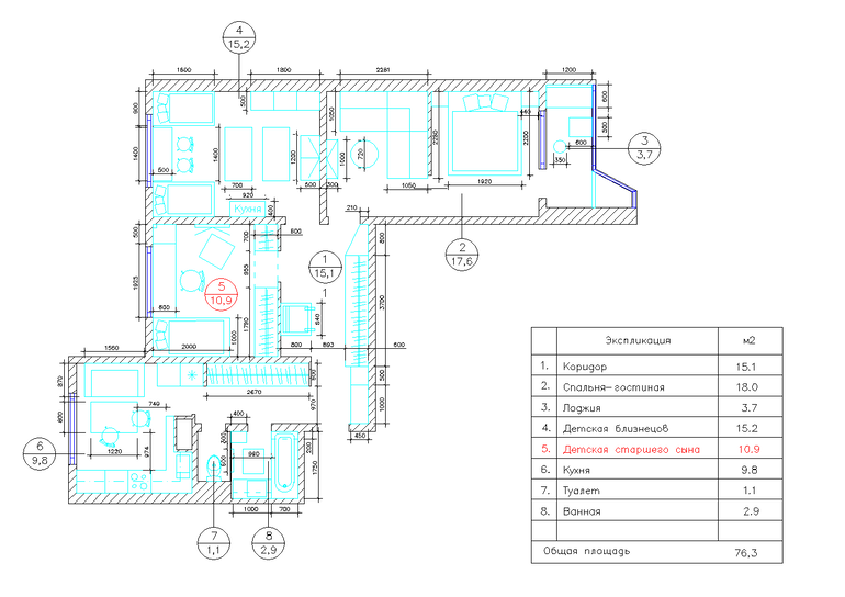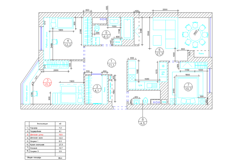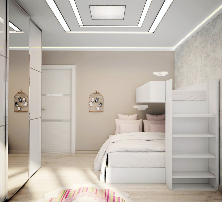 3. А в этой квартире было решено разделить детские по функциям. Одна комната только для сна (13,3м2), другая для учебы и игр (19,7м2). У девочек небольшая разница в возрасте, поэтому им так должно быть комфортно.