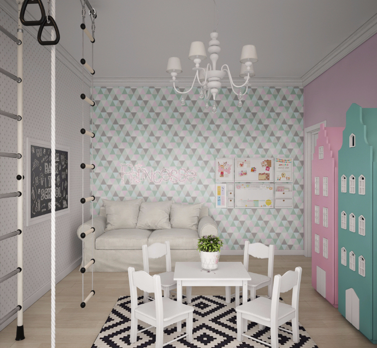 Игровая. Цвета более насыщенные. Контрасты и прямые линии придают комнате динамичности и заряжают энергией.