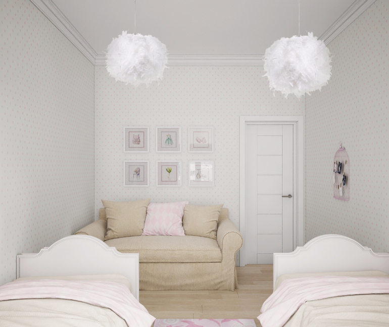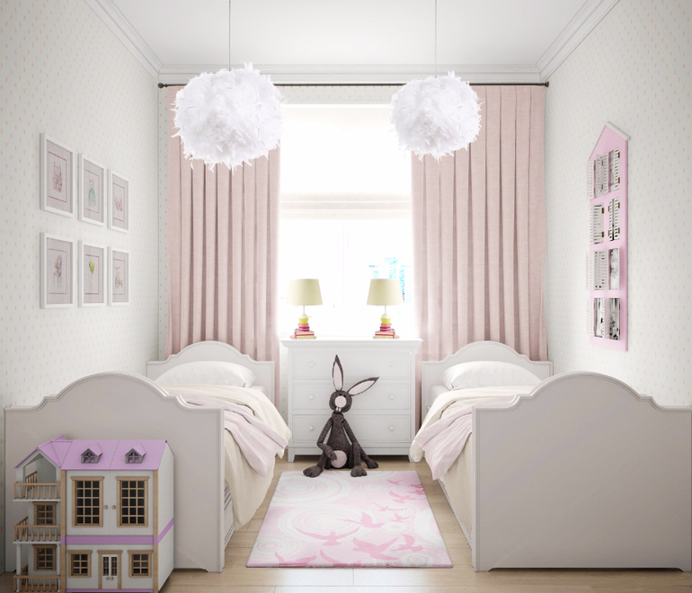 Детская. Выполнена в пастельных оттенках. Нежно-розовый, белый и беж.