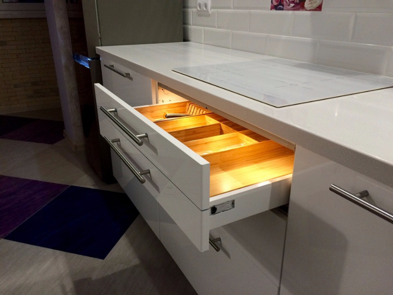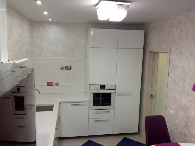 Я была очень вдохновлена проектом Веры с Бэбиблога, сразу хотела кухню без верхних шкафов. Что и было реализовано.