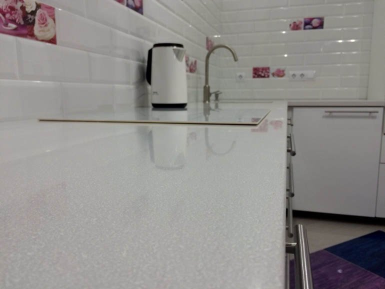Столешница искусственный камень, мойка встроенная (маловата оказалась, но глубока).