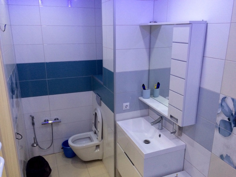 Я была удивлена, когда поняла, что она нам унитаз воткнула на картинке прямо напротив входной двери в ванную, не додумавшись перенести дверь чуть вправо. Ну и много таких косяков было, как говорится «чем думала». В общем, скажем так, дизайнер брала не дорого, хотя и позиционировалсь как человек с 10 летним стажем и нам ее друзья посоветовали… По факту, осталось чувство, что нас надули. И заплатив немалых денег за дизайн проект, мы, по сути, забрали от нее только идею напольной плитки. Дороговато, однако))) И да, было не очень красиво с ее стороны попросить оплату вперед, мы пошли навстречу, отдали, а потом бегали за ней и «пинали», прося доделать в проекте то одно, то другое. В итоге заветную папочку с проектом выцарапывали уже с недовольством. Ну ладно, это наша неопытность, не надо экономить на дизайнерах. Просто муж изначально был против этой идеи вообще, а я хотела все- таки со знающим человеком начать планировать квартиру. Ну и уговорила его на более менее бюджетный вариант, а лучше бы добавили столько же и к профессионалу обратились (только я о них узнала уже много позже, когда начала блог читать….) Посмотрев на дизайнерские решения мы поняли, что не потянем все эти понты))).Поэтому решено было сделать максимально красивой и стильной кухню, большой санузел-ванную.