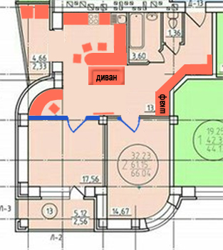 диван от телевизора ну оочень близко и двери загораживает. Лучше наоборот.