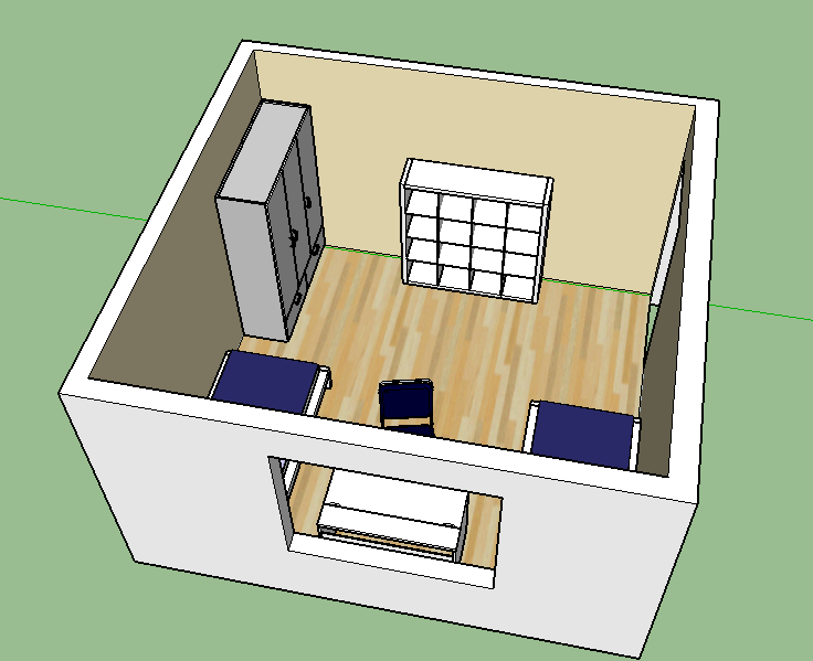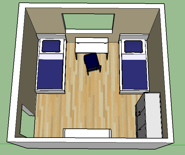 Интерьерное решение детской комнатыДевушки, хочу привлечь на помощь воспаленному мозгу ваши опыт и фантазию. Есть комнатка в новой квартире, почти квадратной формы, площадью 16,9 кв.м. Необходимо заселить туда мальчишку 3,5 лет, а в дальнейшем и его братика, который вот-вот на свет появится. Нужно уместить две кровати примерно 90*200 (старший уже на такой спит, младший будет лет с 1,5), стол для занятий старшего, шкаф-купе и систему хранения игрушек, которых мно-о-ого. Мне надо снять розовые очки, да? Не войдет все это? Вот комната.