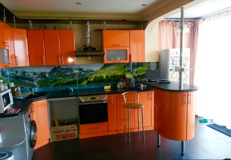 Тут столешницу видно. У меня тоже апельсиновая кухня) но мааааленькая. Шторы у меня с плавным переходом от белого к оранжевому и обратно. Столешница, как и стеновая панель, светлая,типа мозаики рисунок. Тебе можно металлик с черным увязать...просто черный фартук по мне очень мрачно