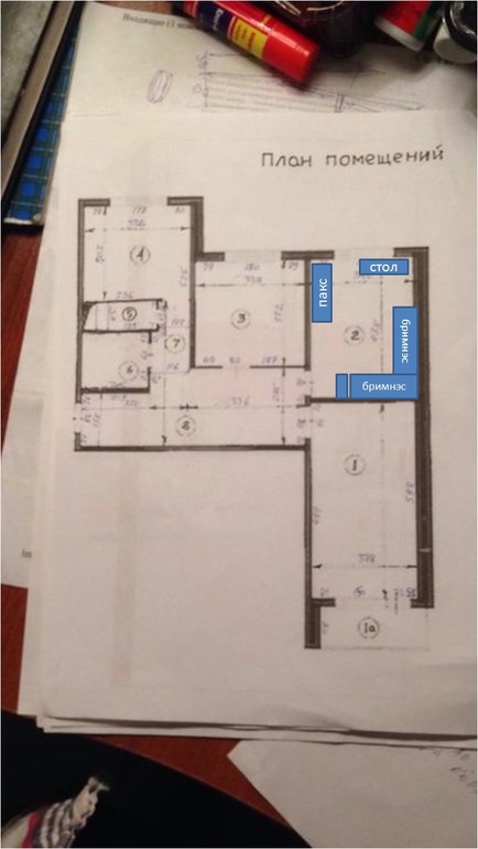 Имеется комната для двоих мальчиков ( на схеме 2) 4, 38 на 3,40( дом серии КОПЭ). Есть шкаф ПАКС 150 на 67( но правда у него двери зеркальные).