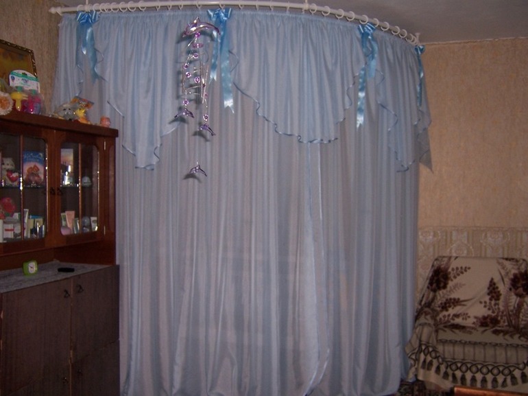 В свое время, в однокомнатной квартире, мы детскую спальную зону декорировали шторами, там стояла детская кроватка, потом, когда малой подрос, там стоял диванчик и он очень любил это "спальное" пространство.....