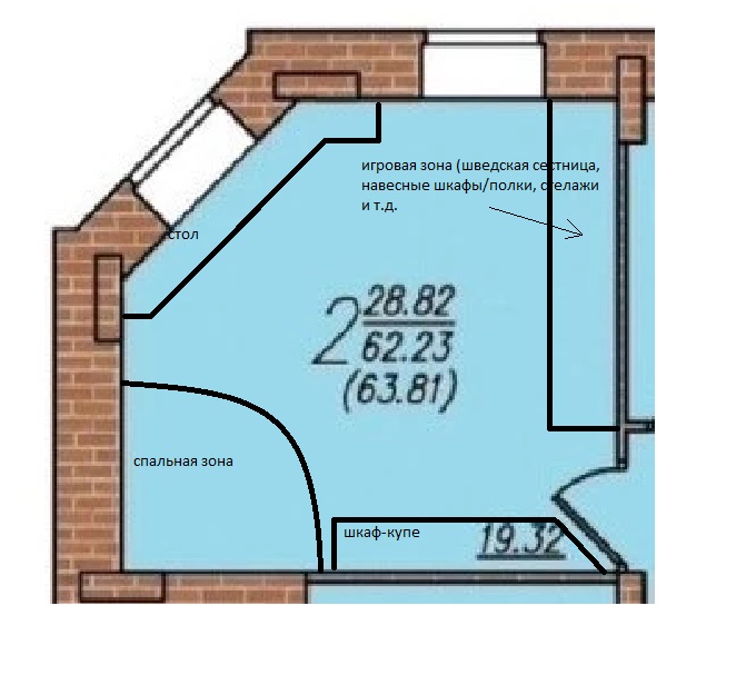 Вопросы и ответыПомогите расставить мебель в комнате,что бы сделать и детскую и зону отдыха?
