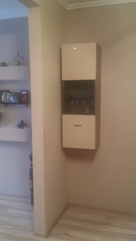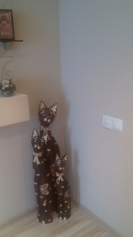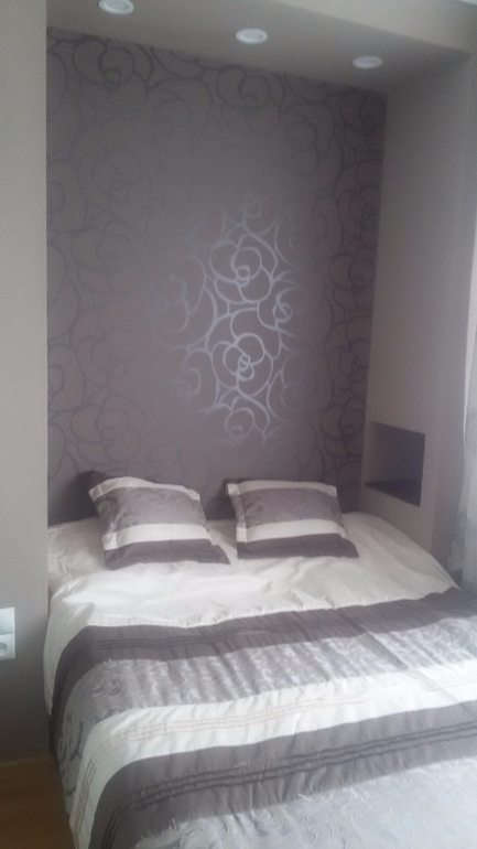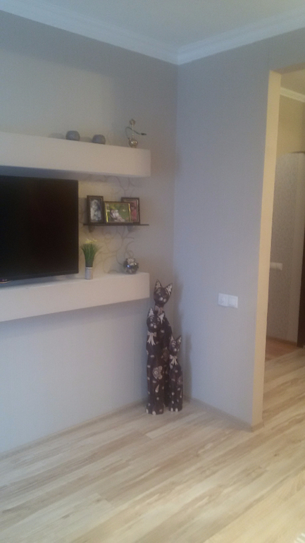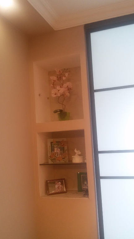 покрашены только сооружения из ГК - ниши, перегородки, ниша под тв, стены - обои (уже под их тон подбиралась краска), краска Снежка латексная Nature, в спальне тон 143 (темнее), в гостиной тон 151 (светлее)