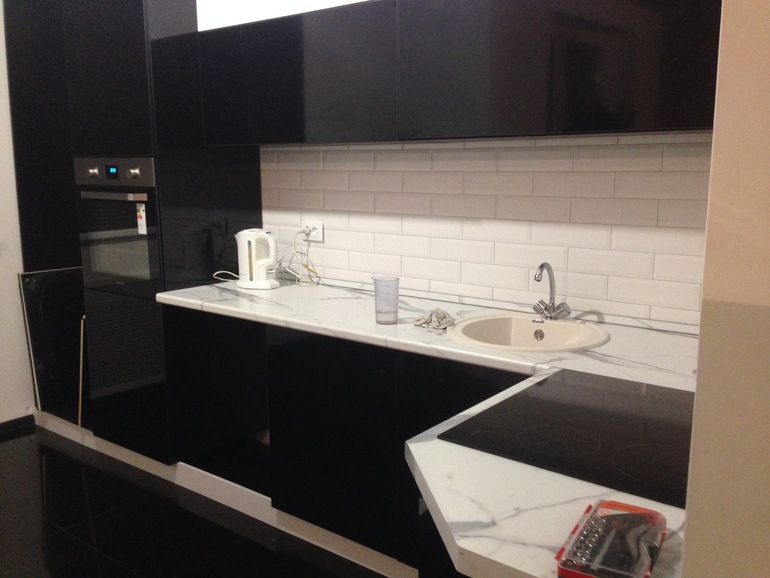 Кухни пока нет, зато плитка черная глянцевая уже пол года на полу в эксплуатации. И ничего, нам нравится, красиво. Да, несомненно грязь видно...но пачкается все одинаково, просто на чем то больше видно а на чем то меньше. Для меня не проблема раз 2 - 3 дня протереть тряпочкой все.