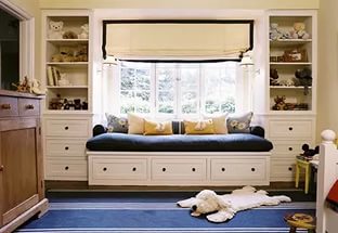 У окна хочу сделать шкаф и стеллаж для хранения игрушек, а между ними скамеечку мягкую) Типо этого: