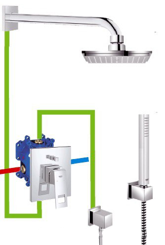 вам нужен: излив для ванны, ручной душ, верхняя лейка, смеситель со скрытой частью, вентиль для переключения потребителей воды, внутренняя часть вентиля на 4 (!) потребителя воды (ввод, верхний душ, ручной душ, излив в ванну)