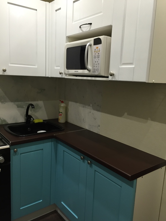 Подруга этажом ниже вообще сделала по другому. У нее угловая кухня полностью до двери. Холодильник, рабочий стол, раковина, плита (электрическая). А там где батарея столик обеденный