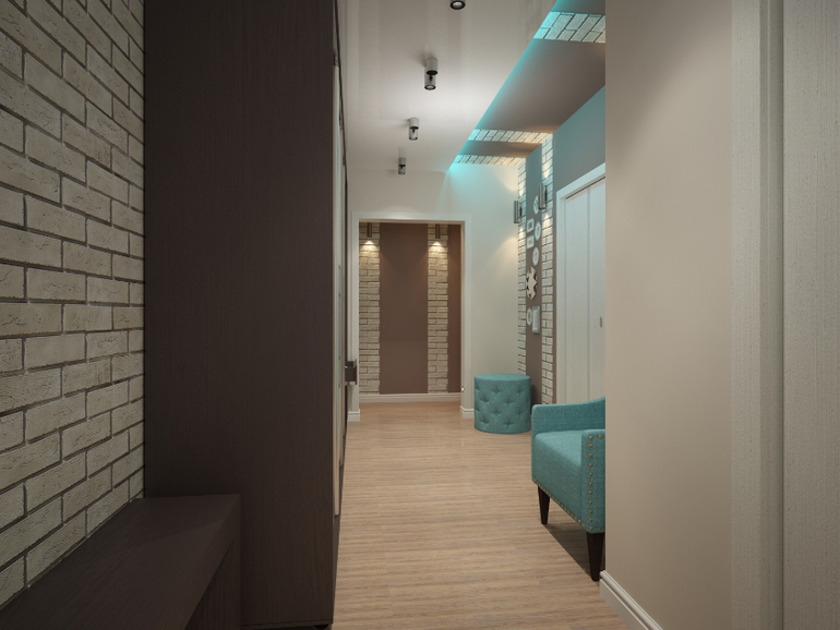 Это стандартная прихожая в квартире трешке. Но выделение "гостевой" зоны цветом и светом делает ее шире и уютнее!