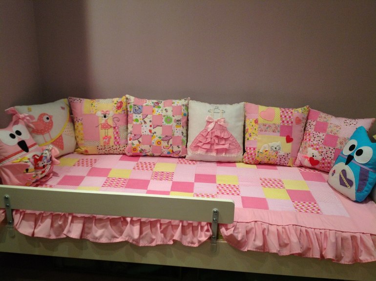 Все сама шила) и подушки, и покрывало, и вигвам)) сама не ожидала, никогда не шила, но в декрете и насмотревшись на красоту в сообществе рукоделие, решила попробовать себя тоже в шитье:)