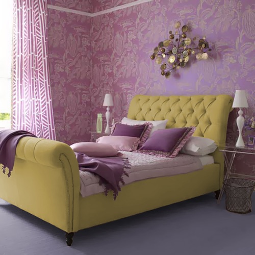 В конце комнаты стеллаж с оливковыми вставками, а вот на покрывале и подушках есть желтые вставки.
