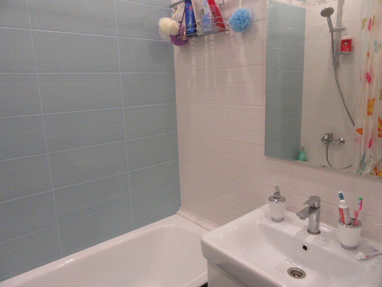 Очень долго выбирала плитку - металась из стороны в сторону, и наконец то случайно приехав выбирать линолеум, я увидела ее...И больше сомнений не возникало) Хотелось чего-то простого, без безумных панно, бордюров и т.д. - мне хотелось спокойствия))Итог мне нравится) Не знаю как другим) В туалете только не нравится бордюр между голубыми плитками - но уже поздно...=))