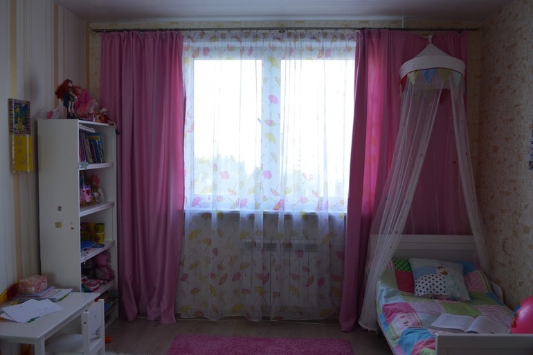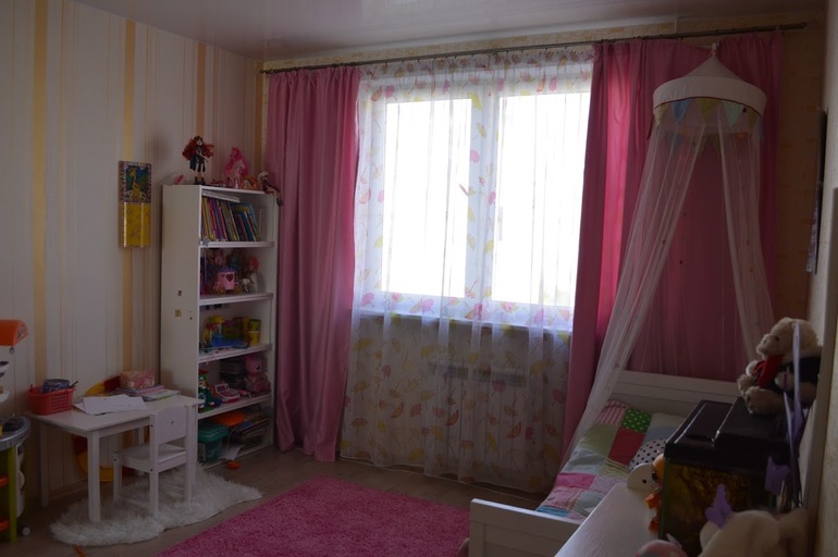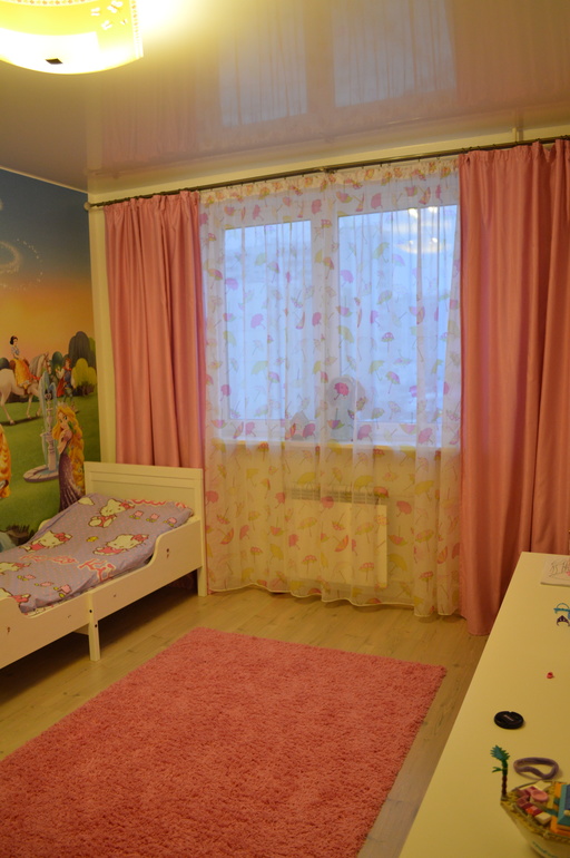 Только не обижайтесь,но...не понравилось ничего.Начну со штор! Вам же не 50 лет,чтоб вешать такие.Ламбрекен остался где-то в 90х годах,вместе с блеском этих штор.Кровать(или диван) стоит по центру,занимая тем самым всю комнату.Стол *типа* у окна...там же темно!?Дочка маленькая у Вас, ей нужно место для игр.На мой вкус - если сменить шторы/покрывало, комната преобразится. Извините еще раз(