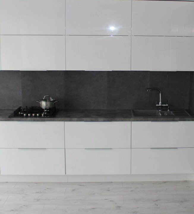 У нее и черная столешка и черный фартук. Смотрится лаконичней и эффектней.