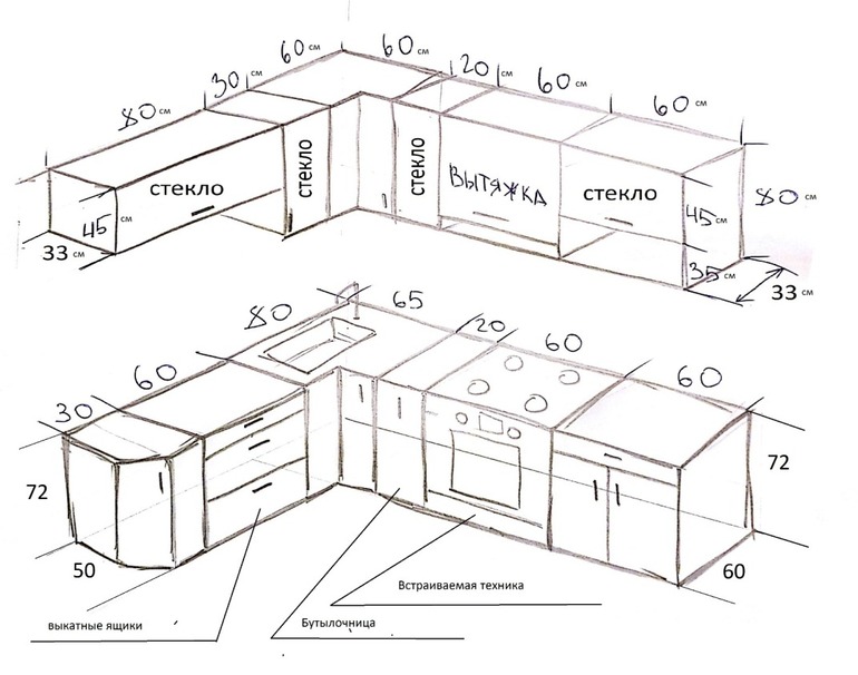 Раковину можно сделать в углу, смотрела в салонах, шоу-румах, вроде удобно, под длинным узким ящик м будет телевизор, иначе его вешать некуда. Сковородки-под плитой, кастрюли-в ящике справа от плиты. Под шкафчиком будут открываться 2 дверки